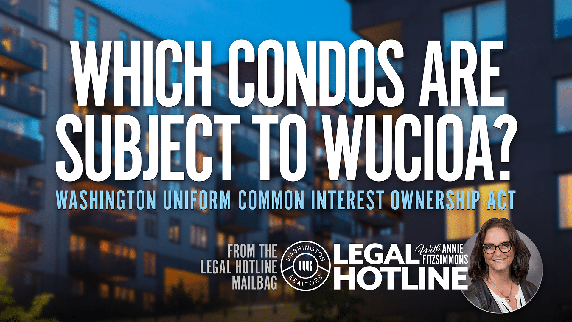 | In today’s Legal Hotline video, WR Legal Hotline Lawyer Annie Fitzsimmons clarifies which Washington condominiums are governed by the Washington Uniform Common Interest Ownership Act (WUCIOA)—and how to confirm it before 2028. You’ll learn how to determine whether a condo is under WUCIOA based on CC&R recording dates, how to identify amendments that opt older communities into WUCIOA, and more. Tune in to make sure you’re using the right forms and asking the right questions! |